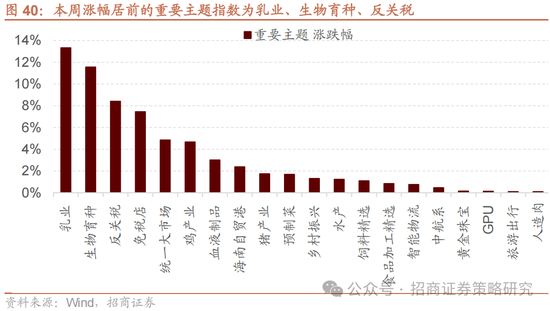 本周A股市场普涨,万得全A下跌4.31%,沪深300下跌2.87%,创业板指下跌6.73%。A股涨幅居前的重要主题指数为乳业、生物育种、反关税。