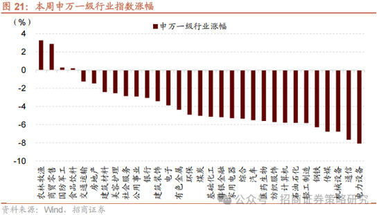 从行业上看,本周申万一级行业涨少跌多,农林牧渔(3.28%)、商贸零售(2.88%)、国防军工(0.28%)等表现相对较好;电力设备(-8.09%)、通信(-7.67%)、机械设备(-6.78%)表现较差。从涨跌原因看,本周表现较好的板块及主要原因:农林牧渔(中共中央、国务院印发《加快建设农业强国规划(2024-2035年)》;中美贸易摩擦下农产品替代需求提升;防御性板块)、商贸零售(中方对美方的关税反制及政策稳市下商贸板块拉升;商务部表示将帮助外贸企业扩宽内销渠道)、国防军工(军工央企增持回购;地缘政治下军贸需求提升);跌幅较大的行业原因,电力设备、机械设备(受美国关税政策影响,全球供应链担忧)、通信(苹果链与AI硬件等海外映射遭打击)。