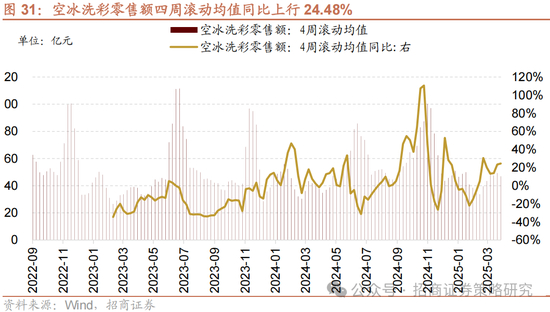 空冰洗彩四周滚动零售额均值环比下行,同比增幅扩大。截至4月4日,彩电零售额周环比下行13.06%至75507.78万元;冰箱冷柜销售额环比下行14.58%至104271.84万元;家用空调销售额环比下行19.96%至149332.38万元;洗衣机销售额环比下行14.11%至76567.21万元。空冰洗彩零售额当周合计40.57亿元,环比下行16.29%,四周滚动均值合计47.0亿元,环比下行4.74%,同比上行24.48%。