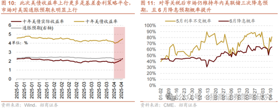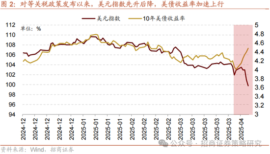 对等关税落地以来,美元指数短暂回升后加速回落,美债收益率快速飙升,驱动的核心在于关税政策反复无常导致美元信用被削弱。在对等关税力度和范围大超市场预期后,全球经历了短期的流动性冲击,除美元指数外,各类风险资产以及大宗商品、甚至黄金都出现了短期调整。4月8日,美国对中国加征关税进一步大幅提升,市场交易转向关税政策的不确定性,美元信用被削弱,市场波动加剧,一贯被视为避险资产的美债也遭到抛售,引发美债收益率的加速上行,美国市场上演股债汇三杀。尽管4月9日特朗普宣布暂停实施 “对等关税” 计划 90 天后美股有所反弹,但美元指数延续下行,美债收益率继续上行。