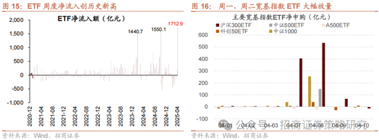 本周ETF出现明显放量。从总量上看,本周ETF净流入1713亿元,创下历史新高;分结构来看,周一沪深300ETF净流入400亿元,周二再度净流入534亿元创下历史新高,并且扩散到其他宽基指数,中证500、中证1000分别净流入149亿、254亿。
