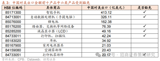 美国对电子产品进口大幅豁免,1000亿中国对美出口产品受到豁免。4月12日,美国海关与边境保护局(CPB)发布《特定产品对等关税豁免指南》,随后特朗普签署总统备忘录,其中根据海关HS编码罗列了20类不受“对等关税”影响的产品,并且在说明中强调此次豁免包括对中国的125%关税。具体来看,此次豁免主要针对电子产品,主要包括智能手机、自动数据处理设备等细分方向,而根据美国海关数据,这些受到豁免的产品2024年中国对美出口金额合计为1002亿美元。
