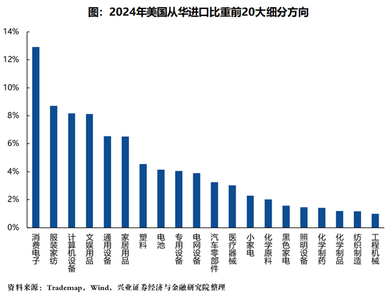 1)美国对华依赖程度较高(30%以上)的品类,例如印刷电路、文娱用品等;