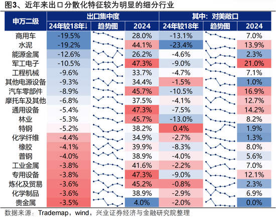 细分品类看,汽车及其零部件、工程机械、金属、化工等品类出口分散化特征较为明显,一方面出口集中度低于整体水平(47.7%),另一方面近年来下降较多。其中,贵金属、化学纤维、钢铁、能源金属等品类对美敞口已降至低位。