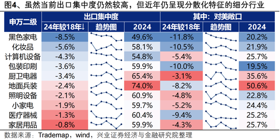 而部分品类虽然当前出口集中度仍然较高,但是关税1.0后呈现出分散化的特征,典型代表是部分家电(黑电、小家电)、化妆品、计算机设备、包装印刷等。