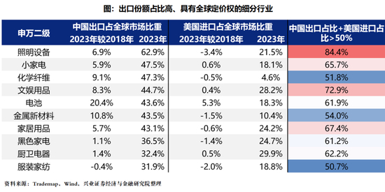 对于国内出口在全球占比处于30%以上,且2018-2019年贸易战之后全球市占率基本保持平稳或者进一步上行的细分品种而言,中国日益占据全球出口市场的主导权,而美国对这些品类有存在必然的进口需求,这也就意味着美国在进口这些商品时或无法越过中国,即使转向其他市场,实际的最终来源或也仍来自中国,包括轻工、电池、纺织品、家电等。