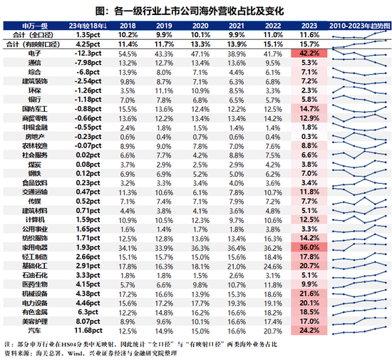 从上市公司海外营收占比看,2018年以来多数行业出海步伐加速,上市公司海外营收占比由2018年末的10.2%提升至2023年末的11.6%。