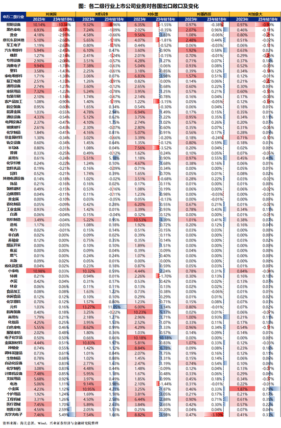 我们进一步用“行业内上市公司海外营收占比x行业对各国出口敞口”测算各行业上市公司业务对各国出口敞口,具体看: