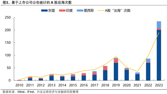 “原产地穿透”原则下,直接布局海外产能的规避效果更优。针对这一轮全球供应链重塑中的关键地区,即东南亚(按照越南、新加坡、泰国、马来西亚、印尼五国统计)、印度、墨西哥,我们对2010年以来出海设立子公司/生产基地的上市公司公告进行系统性梳理,可以看到近年来A股上市公司出海步伐进一步提速。即使2020-2021年有所扰动,但也难以改变大趋势。
