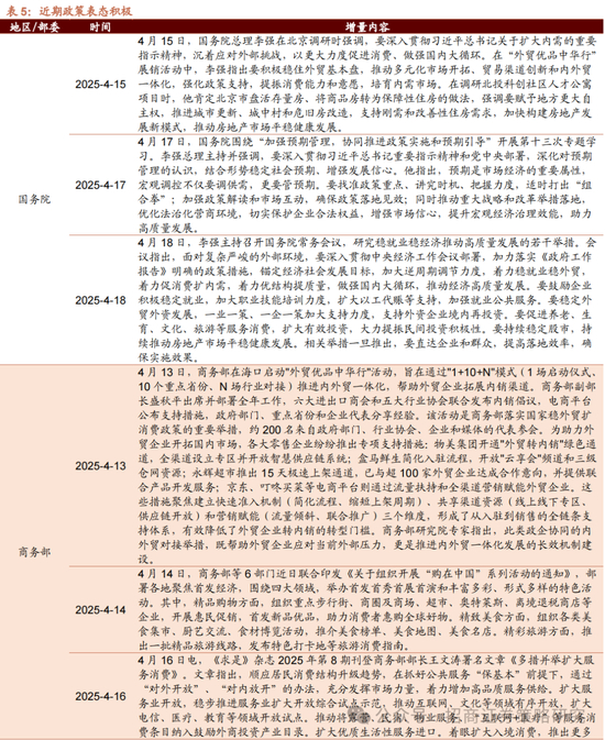 近期政策表态积极,后续政策加力值得期待。从重要表态来看,4月15日,国务院总理李强在北京调研时强调要积极稳住外贸基本盘,推动多元化市场开拓、贸易渠道创新和内外贸一体化,强化政策支持,提振消费能力和意愿,培育内需市场。4月17日,国务院围绕“加强预期管理,协同推进政策实施和预期引导”开展第十三次专题学习。李强总理主持并强调,预期是市场经济的重要属性,宏观调控不仅要调供需,更要管预期。要优化法治化营商环境,切实保护企业合法权益,增强市场信心,提升宏观经济治理效能,助力高质量发展。4月18日,李强主持召开国务院常务会议,会议指出要稳定外贸外资发展,一业一策、一企一策加大支持力度,支持外资企业境内再投资;要持续稳定股市,持续推动房地产市场平稳健康发展。