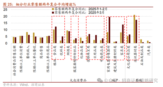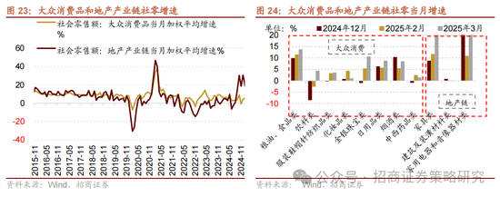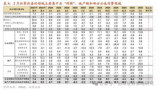 1-3月份在扩大内需系列政策的提振下 ,社会消费品零售额累计同比增幅扩大至4.6%(前值4.0%),单3月份同比增幅扩大至5.9%(前值4.0%)。改善较为明显的细分领域主要集中在:1)受益于“以旧换新”和国补的家电、汽车、通讯器材等,其中家电单3月零售同比增幅扩大至35.1%,汽车零售当月同比增速转正至5.5%,通讯器材自今年加入国补以来,连续两个月零售额实现20%以上增速;2)商品房销售改善带来家具3月零售同比增幅扩大至29.5%;3)金价上涨带来3月金银珠宝零售同比增幅扩大至10.6%;此外粮油食品(13.8%)、烟酒(8.5%)、日用品(8.8%)、文化办公用品(21.5%)等领域零售增速也有所改善。