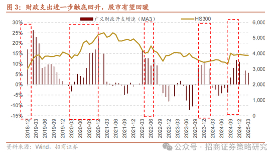 一季度广义财政支出增速达到5.6%,较去年全年提升,而全年预算增速目标为9%左右,因此,二季度开始如果由于美国关税的影响,出口受到冲击,那么财政支出增速将会进一步触底回升,我们此前已经分析过,财政支出的持续回暖对股市的回暖有着重要意义。