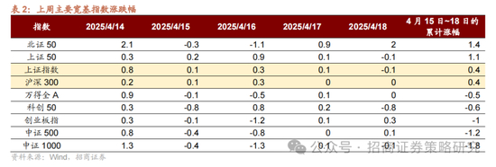 从行业上看,本周申万一级行业涨多跌少,银行(4.04%)、房地产(3.40%)、煤炭(2.71%)等表现相对较好;国防军工(-2.55%)、农林牧渔(-2.15%)、计算机(-0.84%)表现较差。从涨跌原因看,本周表现较好的行业及主要原因:银行(年初以来,已有农业银行、邮储银行、招商银行、中信银行等多家上市银行获得险资举牌;一季度金融业GDP同比增长3.8%)、房地产(青岛出台促消费、惠人才、活市场的12条楼市新政;一季度房地产业GDP同比增长1%;3月商品住宅销售价格环比上涨城市个数增加)、煤炭(国家发改委、能源局印发《新一代煤电升级专项行动实施方案(2025—2027年)》,推进煤电转型升级);跌幅较大的行业及主要原因:农林牧渔(主题性投资阶段性退潮)、国防军工(前期板块涨幅明显)、计算机(美方关税豁免政策不定)。