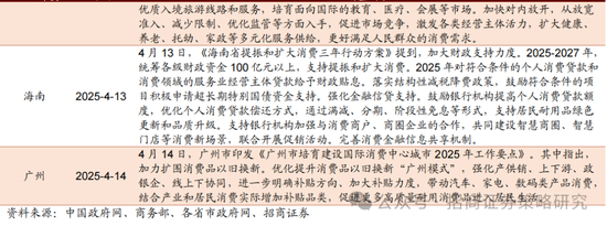 ➢消费方面:1)商务部:4月14日,商务部等6部门近日联合印发《关于组织开展“购在中国”系列活动的通知》,部署各地聚焦首发经济。4月16日电,《求是》杂志2025年第8期刊登商务部部长王文涛署名文章《多措并举扩大服务消费》。文章指出,顺应居民消费结构升级趋势,在抓好公共服务“保基本”前提下,通过“对外开放”、“对内放开”的办法,充分发挥市场力量,着力增加高品质服务供给。2)海南、广州发布促消费政策:4月13日,《海南省提振和扩大消费三年行动方案》提到,加大财政支持力度。2025-2027年,统筹各级财政资金100亿元以上,支持提振和扩大消费。4月14日,广州市印发《广州市培育建设国际消费中心城市2025年工作要点》。其中指出,加力扩围消费品以旧换新。