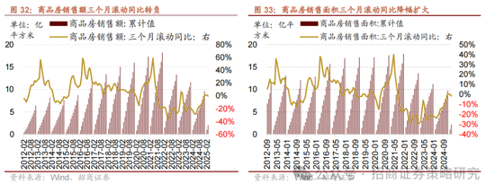 1-3月份房屋新开工面积累计同比降幅收窄,房屋竣工面积累计同比降幅收窄;商品房销售额、商品房销售面积累计同比降幅收窄。1-3月份房屋新开工面积累计值为1.3亿平方米,同比下行24.40%,降幅较前值收窄5.2个百分点,三个月滚动同比收窄至-20.57%(前值-23.62%)。1-3月份房屋竣工面积累计值为1.31亿平方米,同比下行14.30%,降幅较前值收窄1.3个百分点,三个月滚动同比收窄至-23.26%(前值-27.56%)。