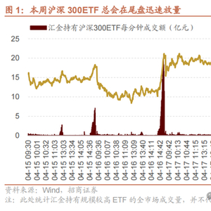 本周,在市场出现盘中调整时,再度ETF成交量再度出现了明显放大,指数企稳回升的态势。就在普遍认为在市场平稳运行后,短期汇金等重要机构投资者可能不太会再入市操作时,本周(4月14日~4月18日)每当重要权重指数(沪深300和上证指数)在盘中下跌时,在盘中或者临近收盘时,以沪深300ETF为代表的部分ETF总是会出现成交量的短期迅速放大,最终使得沪深300和上证指数基本平盘或者录得微幅上涨。