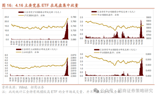 本周主要宽基ETF集中在尾盘放量。本周除周一外的四个交易日重要宽基指数ETF均呈现放量净买入,或为重要机构投资者通过ETF稳定市场。从日内成交额分布来看,本周宽基指数集中在尾盘放量:周三沪深300、上证50、中证500及中证1000ETF在临近收盘时成交量明显放大,推动主要指数快速上涨;周五沪深300与上证50在尾盘明显放量,对指数形成有力支撑。