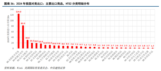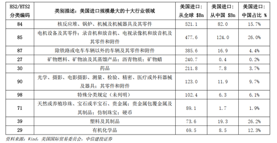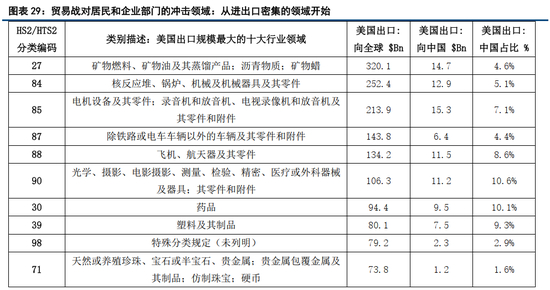 如图表26-图表27,按世界海关组织的国际贸易商品名称协调编码制度(Harmonized Commodity Description and Coding System, 缩写HS;美国海关使用其美国衍生版本,Harmonized Tariff Schedule,缩写HTS)的二级商品分类(有99个二级分类,即HS2/HTS2目录下的大类商品1-99)——2024年美国进出口商品规模较大、或集中度较高的主要行业,主要有:机械及零件(84)、电机影音设备(85)、非铁路车辆(87)、矿物燃料制品(27)、药品(30)、光学器械具件(90)、玩具及配件(95)、鞋类及零件(64)、飞机航天器(88)、油籽植物饲料(12)、铜制品(74)等——完整的2024年美国总出口和总进口的HTS2分类明细,与其中的中国份额占比,可参见文末的附录B和附录C。