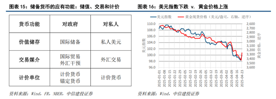 从4月2日特朗普开启本次贸易战以后,美元指数加速走弱,贸易战的一系列当前和后续潜在措施,动摇了美元作为全球储备货币的三大功能,即价值储存、交易媒介和计价单位,同时,特朗普在贸易战内外压力下,持续就美联储货币政策和人事任免表态,进一步削弱了全球对美元维持储备货币自律的信心。如特朗普继续坚持贸易战和削弱美元储备货币功能,则后续美国的美元贬值预期、政府债务压力、流动性宽松预期、经济衰退预期、全球公共服务和美元金融体系武器化等问题将进一步凸显——则全球央行、外汇储备、主权基金等大型财富管理机构将进一步调降美元资产的配置比例,欧元、黄金、人民币等非美元资产将进一步接受由美国市场流出的全球资金再平衡收益。