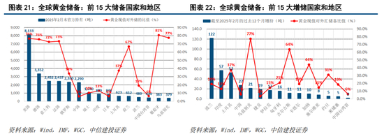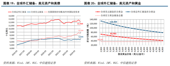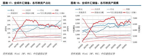 如图表15-图表22:1)4月2日贸易战开启之后,美元指数已跌破100荣枯线,黄金价格一度上探3500美元/盎司历史新高;2)按IMF统计,当前全球外汇储备总规模约12.4万亿美元,其中,美元储备约6.6万亿美元,占比约53.6%,按3300美元/盎司的伦敦黄金现价,每1个百分点的全球美元储备调仓,约可购黄金625吨,每1个百分点的全球总外汇储备调仓,约可购黄金1165吨;3)按世界黄金协会统计,截至2025年2月,全球官方黄金储备持有共计约36195吨,按2月末的伦敦黄金现价2835美元/盎司估算——黄金已成为与欧元权重并列的第二大全球储备资产,各占全球总储备的约20%左右份额,与约占53.6%的美元储备一起,共同构成了当前全球外汇储备的三大主要资产。