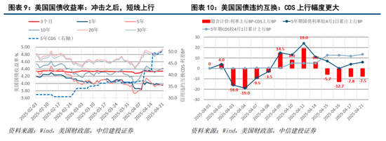 从4月2日特朗普开启本次贸易战以后,美国国债市场出现了较显著的信心危机,主要期限国债利率不降反升,以国债违约互换CDS计价的违约风险上行快于利率上行,反映了国债市场既在开始计价经济衰退,又在开始计价主权信用违约。如图表9-图表12:1)截至4月21日收盘,较贸易战开始的4月2日,5年期美国国债违约互换CDS上行约13BP,5年期美国国债收益率上行约6BP,去掉违约风险补偿增加部分,隐含的国债利率下行约7BP;2)截至最新公布的2025年2月数据,海外官方资金继续对美国长期资产保持减持状态,海外官方和私人投资者合计持有约8.6万亿美元美国国债,占市场总规模的约24%。