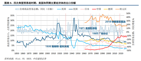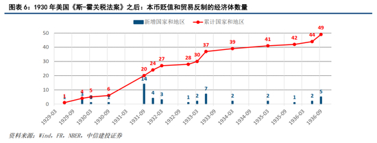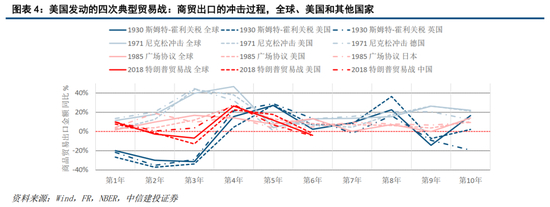 如图表4-图表6,1930年6月美国颁布《斯姆特-霍利关税法案》是冲击最显著的一次,全球商贸出口连续三年同比下行约20%-30%,美国受到广泛的贸易报复,其出口下行近40%大于全球平均,金本位的国际汇率体系发生了贬值战,虽然美国、英国等大国后续采取了双边互惠制、帝国特惠制等贸易补救措施,但由于最初的关税等措施并未能及时撤除,负向的贸易和经济冲击最终延宕数年,构成了美国大萧条的重要一环。