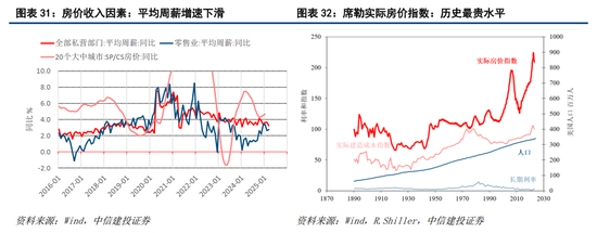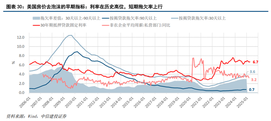 随着特朗普贸易战的开启,美国房地产市场的价格去泡沫压力在于:1)一是美国实际房价指数,仍在历史最高水平;2)二是房价的居民收入支撑因素承压,贸易战如不能快速实现和解,本就正在下滑的非农周薪增速,将可能进一步减速甚至转负;3)三是除收入外的另一重要支撑,美国的房贷利率正在高位,目前与其次贷危机前的峰值水平相当。如图表30-31,从2024年下半年以来,美国30天以上和30-90天的居民按揭贷款拖欠率,出现了次贷危机以来的新一轮较快边际上行,反映了房贷居民短期流动性条件的转弱——如这一指标在未来30-90天继续,意味着当年次贷危机早期信号的重现,短期拖欠将逐步转为长期拖欠,最终形成实际违约。