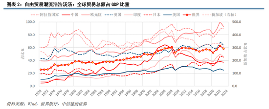 随技术进步带来全球更紧密互联互通,当前全球贸易总额占全球GDP的比重,已从英国工业革命前的不到1%攀升至2023年的约60%,多数国家深度融入全球经济分工合作,任何国家的逆全球化和贸易战企图,都是不合经济道理、不得世界人心、没有出路的。如图表2,全球众多经济体年贸易总额占GDP比重在40%以上,新加坡等外贸型国家的贸易总额占GDP比重超过300%,多数经济体不会认同极限施压的贸易战举措。