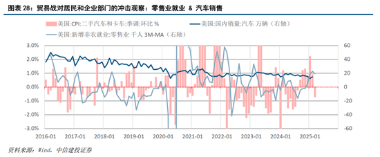 如图表28-图表29,从历史经验上,对于需求型经济体,零售业是对贸易战相对最敏感的行业——其中,零售业就业和汽车零售的相关数据,常被用作观察贸易战对居民消费和信心冲击的关键判断指标,目前,汽车销售数据在美国已出现走弱迹象。