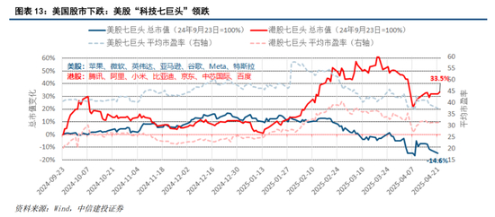 从4月2日特朗普开启本次贸易战以后,美国股票市场出现了较显著的信心危机,由于担心贸易战冲击企业营收,尤其是上市企业中的跨国企业、科技企业和消费企业,标普500等核心指数从历史最高估值开始回撤,美股科技七巨头向下领跌。如图表13-图表14,截至4月21日收盘,美股标普500指数的滚动市盈率约为23.5倍,从前期历史性高点的约29倍开始回撤,但仍属于历史较贵、全球最贵的估值水平,美股较德国、日本、英国、我国等全球其他主要股市的市盈率仍偏贵约10倍左右——如贸易战继续而不撤除,这部分估值溢价将持续受到信心减弱、资金流出、经济前景黯淡等因素的多重冲击。