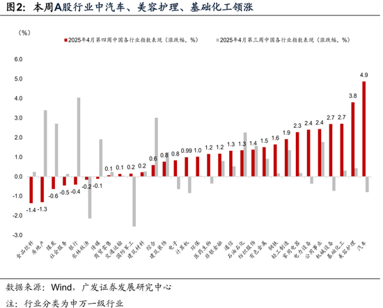 第二,4月第四周“关税缓和”预期之下,全球资产演绎“风险计提”后的冲回,美欧日股市悉数反弹。黄金冲高跳水,交易指标回落至“中性”。中国资产在政治局会议落地背景下亦整体上行;但随4月末日历效应临近,行业轮动加快,汽车、美护、化工领涨。