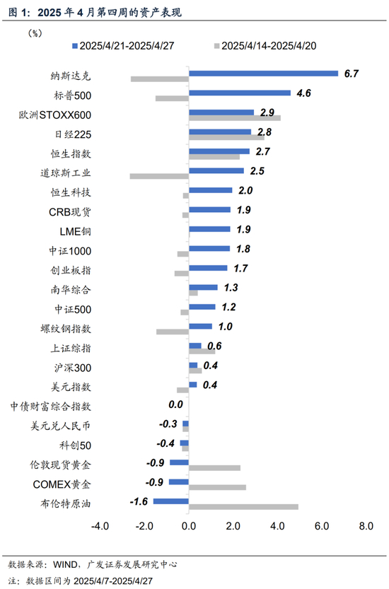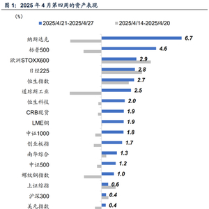 一是伴随着特朗普关税谈判言论的发布,全球股市继续演绎“前期关税风险一次性计提”后的冲回,美欧日股均企稳走高,美股波动率进一步回落至25%下方。美股两大股指本周表现靠前,纳指领涨6.7%,标普500收涨4.6%,道琼斯工业周涨幅2.5%。标普行业中前期调整明显的信息、可选、通信反弹最为明显。欧日股市整体表现相当,欧洲STOX600、日经225分别收涨2.9%、2.8%,其中德国DAX指数再度领涨4.89%。中国资产延续反弹,港股恒生科技止跌回升,收涨2.0%,恒指连续两周上涨,本周升2.7%;A股上证综指、沪深300均小幅上涨,创业板指表现更为积极,收涨1.7%;境外中国资产亦表现亮眼,纳斯达克中国金龙指数周涨7.25%。