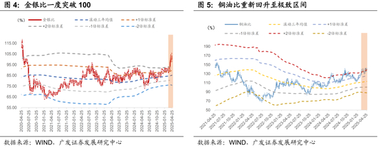 二是关税缓和预期与黄金进入“超买”区间共振,金价冲高后跳水,周度收益转负;隐含波动率一度升至28.44%,处于历史80%高位。COMEX黄金期货RSI(6日)先升后降,冲高后较快回落至55.63,当前处于“中性”区间。原油经历前期超跌反弹后,本周在“多空博弈”中震荡走低。铜价亦受关税缓和预期提振,但在供需不确定持续下维持高位震荡,期货价格小幅上涨1.9%。国内定价螺纹钢期货、南华工业品价格指数周涨幅分别为0.7%、1.1%,BPI指数连续三周环比回落。截止4月27日,铜金比较上周位置明显回升,处滚动三年的-2.5倍标准差(上周为-2.8倍标准差);铜油比则重新走高,升至滚动三年的+2.1倍标准差(上周为+1.78倍标准差)。