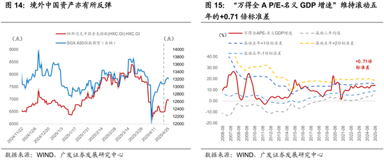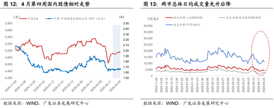 四是在政治局会议精神落地预期下,市场继续反弹,但股指走势有所分化。随着“临近4月末财报披露关口+五一小长假将至”,市场交投活跃度先升后降。板块轮动加快,周初贵金属、周期领涨,周中机器人等成长板块表现活跃,中小盘总体反弹更为明显。万得全A涨幅小幅扩大至1.15%,宽基指数内部涨跌不一,小盘表现更优。上证50、中证500、中证1000、中证2000周涨跌幅分别录得-0.3%、+1.2%、+1.8%、+2.7%。本周约77.4%的行业录得正收益,前期相对占优的红利板块表现稳健,汽车、美容护理、基础化工、机械设备分别领涨4.9%、3.8%、2.7%、2.7%。观察股市“估值-宏观偏离度”,截止4月25日“万得全A P/E-名义GDP增速”升至14.11,处于滚动五年的+0.71倍标准差(+1倍标准差是经验警示位)。10年期国债利率窄幅上行1.13BP。
