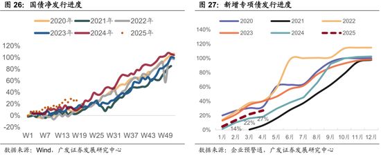 从4月央地财政进度有所分化,中央进一步加速,地方仍偏缓。4月国债净融资进度26%,较近年同期明显加快,不仅包括了以非资本性开支为主的普通国债,还包含月末特别国债的集中发行。与之相对的是地方新增专项债,略强于去年同期,但相较其他年份仍然偏弱。4月25日政治局会议提到[7]“加快地方政府专项债券、超长期特别国债等发行使用”,因此在前期确定的新增专项债、特别国债加快发行使用后,才有后续加码的必要和空间。