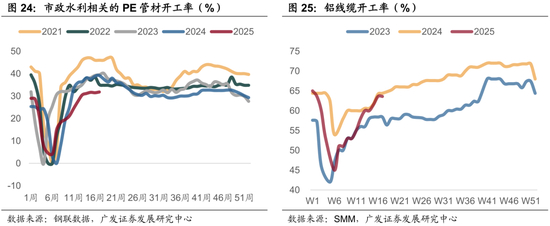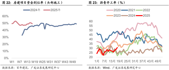 本期百年建筑的建筑工地资金到位率由降转增,其中非房建项目(即基建项目)环比增势显著,房建则有所下降。但从同比角度看则相反,目前房建略强于去年同期,非房建始终略弱于去年。百年建筑网的水泥样本数据也反映类似信息,[6]百年建筑表示基建需求韧性较强,然而相较往年仍有一定差距,主要受制于地方财力约束,后续关注专项债进度。实物工作量方面值得关注的是沥青开工率连续两周回升,这可能代表着1-3月专项债对应的道路项目开始施工。而电力侧开工率仍保持较强趋势;市政水利领域则随着水利国债资金的逐渐使用开始退坡。