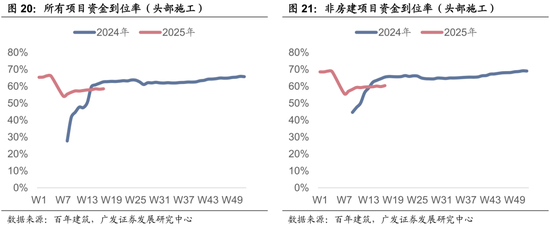百年建筑网数据,截至4月22日,样本建筑工地资金到位率为58.54%,周环比上升0.26个百分点。其中,非房建项目资金到位率为60.41%,周环比上升0.56个百分点;房建项目资金到位率为49.32%,周环比下降1.12个百分点。