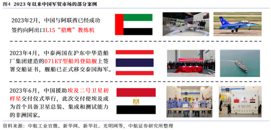 经过几十年的投入,我国的军工行业已基本具备“内循环”的技术基础和物质条件。当前,国际军贸市场对“质美价优”武器装备的需求日益旺盛,这使得中国军贸在国际市场上的竞争优势正在不断提升。2023年以来,中国已与阿联酋签约出口L15教练机,面向泰国交付舰船,援助埃及卫星(详见下图)。