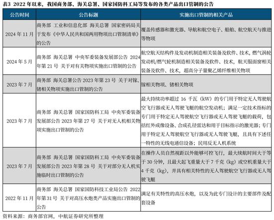 2022年以来,我国商务部、海关总署、国家国防科工局等发布的出口管制公告中,实施出口管制的产品包括无人机、传感器、航空航天结构件及发动机制造相关装备等。商务部表示,出口管制不是禁止出口,出口符合相关规定的,将予以许可。实施出口管制,旨在维护国家安全、履行国际义务。2024年11月,商务部会同有关部门相继发布《中华人民共和国两用物项出口管制条例》(简称《条例》)和《中华人民共和国两用物项出口管制清单》(简称《清单》),自2024年12月1日起实施。商务部表示,统一的《清单》将有利于引导各方全面准确执行中国的两用物项出口管制法律政策,有利于提高两用物项出口管制治理效能,更好地维护国家安全和利益、履行防扩散等国际义务,更好维护全球产业链供应链安全稳定畅通。我们认为,有法可依方可市场有序,《条例》和《清单》的发布打消了市场对两用物项出口全部“一刀切”的疑虑,有利于维护世界和平和周边地区稳定,促进合规贸易发展,对我国军工产业链供应链的健康有序发展和军贸出口具有积极意义。