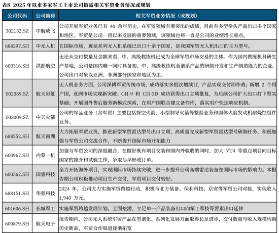 而伴随我国军贸市场的复苏,多家军工上市公司,包括央国企及民参军上市公司已经布局或准备积极拓展国际市场,2025年以来,中航成飞、中无人机、洪都航空、航天彩虹、中天火箭、航天南湖、内蒙一机、国睿科技、北方导航、中兵红箭、富吉瑞、国科军工等多家军工上市公司公告里明确公司业务已经涉及或正在规划军贸业务(详情请见表8)。