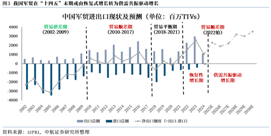 我们判断,在地缘政治事件频发、新型战争形态出现的背景下,全球军贸市场整体将持续快速增长。对于我国而言,随着我国自身产品竞争优势与生产能力的不断提升,之前国内产能倾向于解决内需的情况有望逐步改变,叠加部分国家的军贸出口萎缩导致其下游客户需求存在缺口、全球战争形态的演变等因素,我国军贸短期内有望持续增长,并在“十四五”末期由恢复式增长向供需共振驱动增长转变。