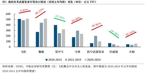 从我国具体出口的武器装备种类来看,以2010-2014年为基准,可以发现,近年来增速较大且维持在高位的武器装备种类主要为飞机(含无人机)、舰船、导弹、防空武器系统、火炮等航空航天装备。我们认为,一方面原因在于近几次信息化战争(亚阿冲突、以色列周边冲突及俄乌冲突等)中,无人机、导弹等具备较高效费比的武器装备得到突出体现;另一方面,从近年来珠海航展上亮相的各类出口飞机(含无人机)、导弹装备型号受到了客户的广泛关注来看,我国航空航天装备技术发展迅速,相关军贸出口装备“高性价比”的优势得到了进一步认可及巩固。
