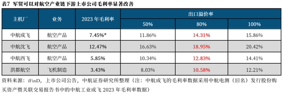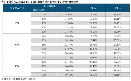 以国内几个航空产业下游上市公司为例,2023年各上市公司的航空业务毛利率均在10%左右或低于10%,假设其军贸收入占比可以提升至10%,出口溢价率在80%,可以发现,各上市公司航空业务的毛利率均将出现不同程度的大幅提升,部分公司毛利率甚至提升至当前的2-3倍,改善效果显著。