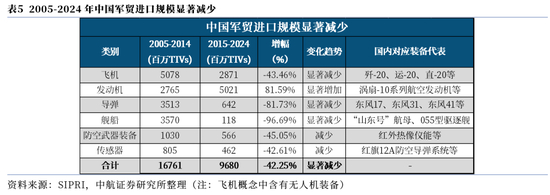 中国近十年(2015-2024年)的军贸进口96.80亿TIV,相较于上一个十年(2005-2014年)军贸进口(167.61亿TIV)下降42.25%,主要系飞机(含无人机)、导弹、舰船等武器装备的进口指标大幅下降。