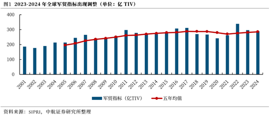 2024年,SIPRI全球军贸指标略有下降,但是军贸热度仍然维持在高位,根据SIPRI数据,单年度看,全球军贸指标在2022年高速增长,创下21世纪以来新高,但由于军贸订单签订与交付存在时间差,以及近年来二手装备占比提升的影响,2023年全球军贸指标同比下降12.37%,2024年再次同比下降2.51%,而2020-2024年军贸指标的五年均值则依旧实现了同比1.56%的增长。基本符合历史上军贸指标存在周期性波动,但整体重心上行趋势不变的特点。