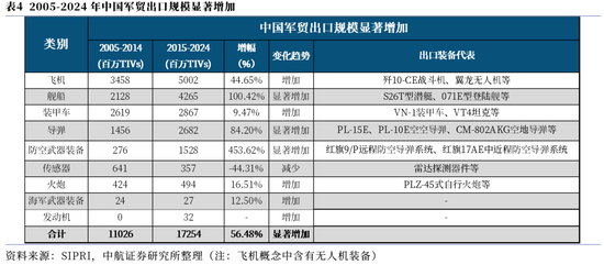从十年周期的维度来看,根据SIPRI数据,中国近十年(2015-2024年)的军贸出口172.54亿TIV,相较于上一个十年(2005-2014年)的军贸出口(110.26亿TIV)增长56.48%,增长显著。从细分领域上来看,主要是飞机(含无人机)、防空武器装备、舰船、装甲车、海军武器装备、导弹等武器装备出口趋势明显增加。