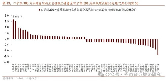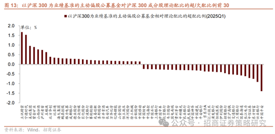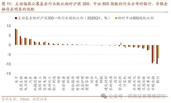 截止2025Q1,主动偏股公募基金的行业配置中,无论相对沪深300指数,还是中证800指数,对金融行业(银行+非银金融)的配置比例都偏低,低配比例超过7%;其次是公用事业,低配比例超过2.5%。