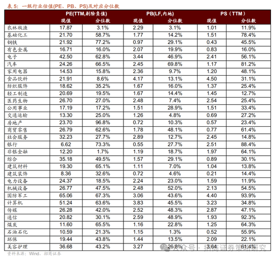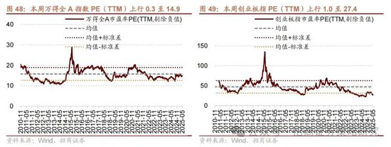 本周整体A股估值水平上行。截至5月9日收盘,万得全A指数PE(TTM)为14.9,处于历史估值水平(10年以来)的48.2%分位数。创业板指PE(TTM)上行1.0至27.4,处于历史估值水平的6.9%分位数。代表大盘股的沪深300指数PE(TTM)上行0.2至11.8,处于历史估值水平的49.1%分位数。代表中小盘股的中证500指数PE(TTM)上行0.5至21.5,处于历史估值水平的35.8%分位数。