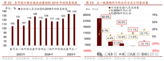 “五一”自驾游为出行主力,民航水路客流同比增长较快。据交通运输部测算,五一假期期间(5/1-5/5),全社会人员流动量累计达14.66亿人次,日均2.93亿人次,较2024年日均同比增长7.91%,较2019年日均同比增长33.49%。分出行方式看,自驾出行仍是主流,日均出行2.33亿人次,同比增长8.09%,约占到人员流动总量的近79.3%。铁路日均出行2034万人次,较2024年同比增长10.83%,较2019年同比增长36.65%。民航日均出行223万人次,较2024年同比增长11.84%,较2019年同比增长11.1%。水路和客车客运量同比有所增长,日均客运量分别达172万人次、3631万人次,较2024年同比分别增长23.65%和4.43%,但受居民出行习惯变迁以及飞机、铁路等交通工具的快速发展,客流较2019年同期下行。