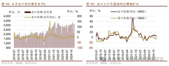 2)高新技术产品、机电产品出口同比6.5%、10.1%,增幅较前值有所收窄,但仍保持相对较高增速。其中对美出口依赖度较高的领域增速下滑较多,如自动数据处理设备(2024年对美出口占比约23.7%)4月出口同比增速由正转负至-1.7%、通用设备(对美出口占比约11.8%)4月出口同比增幅收窄至17%;